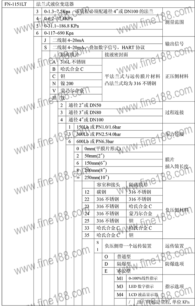FN-1151LT 系列法兰式液位变送器是一种采用标准法兰直接安装在管道或容器上的现场变送器。由于隔离膜片直接与被测介质相接触,无须将正压侧用导压管引出,因此可以测量高温、高粘度、易结晶、易深沉和强腐蚀等介质的液位、压力和密度,然后将其转换成4~20mADC 信号输出。液位变送器与智能信号放大器组合,可构成智能型液位变送器,与符合HART 协议的手操器配合,可以互相通讯,进行设定和监控。